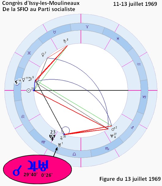 — Le Parti socialiste, sa naissance, converge du congrès d’Alfortville le 4 mai 1969 et c’est entre les 11-13 juillet qu’il se « déclare » avec le Congrès d’Issy les-Moulineaux. Entre ces dates, le cycle de conjonction Jupiter-Uranus est en orbe de manifestation, les phases qui encadrent le congrès dans son plein étant les suivantes :