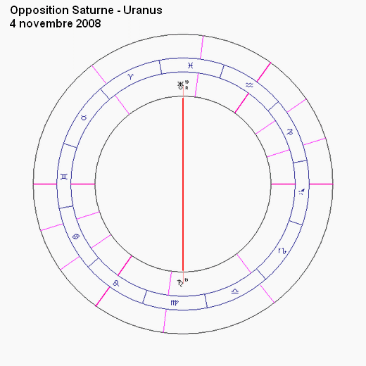 Durant la période 2008-2010, Saturne va à l’opposition d’Uranus. Cette phase est un élément important du cycle Saturne-Uranus dont la dernière conjonction date de 1988 par le Sagittaire, avec un orbe d’étalement entre 1987-89.