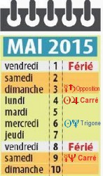 27 avril 2015, par Marc CerbèreLe ciel astrologique qui accompagne les deux premiers ponts du mois de mai se calque sur le calendrier des humains, car les formations planétaires des rapides sont peu nombreuses même si des cycles lents demeurent en orbe d’influence de fond sur le cours de certaines vies, que ce soit en promesse d’évolution et de joie, ou dans l’épreuve et la peine.