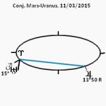 1er mars 2015, par Marc CerbèreLe dynamisme des énergies planétaires de la seconde décade du mois de mars s’accélère avec un trigone Mars-Jupiter le 10 et une conjonction Mars-Uranus le 11, sous toile de fond du trigone [de période] Jupiter-Uranus qui s’est formé le 3 mars 2015. Cette période n’est pas celle de l’hésitation, mais bien celle de l’action foudroyante, parfois musclée, au profit d’une évolution ou pour forcer une situation. Un danger peut préexister.
