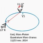 21 octobre 2014, par Marc CerbèreAprès la suite planétaire Mercure-Vénus-Soleil de la mi-octobre et la conjonction Soleil-Vénus du 25, précédée de l’éclipse partielle de Soleil le 23 - une nouvelle lune plus appuyée que les autres, dont l’influence circonstanciée est surtout à voir dans l’imaginaire d’aucuns - le ciel du mois de novembre 2014 forme des phases planétaires plus radicales, dont la conjonction Mars-Pluton du 11, suivie d’un carré Mars-Uranus, le 13.