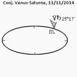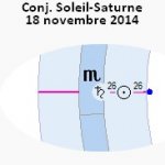 15 novembre 2014, par Marc CerbèreC’est le 18 novembre 2014 que se forme une conjonction Soleil-Saturne sur les 26° [25°55’] du signe du Scorpion, la troisième de la série entre le 25 octobre 2012 [2°] et le 6 novembre 2013 [14°] ; les prochaines conjonctions Soleil-Saturne en Scorpion auront lieu le 1er novembre 2042 [9°] et le 13 novembre 2043 [21°]. Notre visiteur trouvera sur le site les différents articles des conjonctions précédentes.