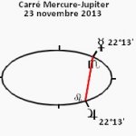22 novembre 2014, par Marc CerbèreLe déroulé de Jupiter en Lion se heurte, sans effet durable, à un carré de Mercure sur les 22°, le 23 novembre ; celui-ci s’insère dans le cycle Mercure-Jupiter. L’influence va de la veille [22] au lendemain [24], voire au surlendemain [25]. La mobilité même de Mercure rend cet aspect sans grande portée sur l’avenir, sauf si un engagement intervient dans l’orbe de sa formation.