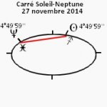 25 novembre 2014, par Marc CerbèreÉloigné de quelques heures [+- 3h] du sympathique trigone Vénus-Uranus, un carré se forme dans la soirée du 27 entre le Soleil et Neptune sur les 5° [4°49’] Sagittaire/Poissons, les dieux lançant les dés, et se jouant des humains. Comédie céleste.