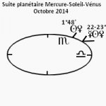 Mercure a évolué dans le signe de la Balance depuis le 2 septembre, progressant vers le signe du Scorpion, y entrant le 28 [à la pendule], puis stationnera et sera rétrograde le 4 octobre, pour entrer à nouveau dans le signe de la Balance le 10 octobre, reprenant un mouvement direct le 25, rejoignant le signe du Scorpion le 9 novembre 2014.