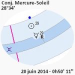 13 juin 2014, par Marc CerbèreC’est le 20 juin 2014 à 0h50’ [à la pendule] que Mercure forme une conjonction inférieure avec le Soleil sur les 28°34’ du signe des Gémeaux. Cette conjonction s’inscrit à la suite du stationnement de Mercure, puis de sa rétrogradation le 7 juin 2014 ; prochain stationnement et reprise du mouvement direct, le 1er juillet 2014.