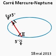 A la suite du carré Vénus-Neptune du 13 mai, voici que ce forme dans l’ordre des relais des « rapides » un carré de Mercure par les Gémeaux à la lente Neptune dans le signe des Poissons, le 18 mai 2013 sur les 5°, répartis [carré Mercure-Neptune].