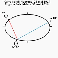 Le sextil Mercure-Vénus [dès le 28] est de bonne composition pour renforcer les énergies de la nouvelle lune en Gémeaux, mais il vaudrait mieux s’appuyer sur le trigone Soleil-Mars pour une intention manœuvrière, que sur le temps du carré Soleil-Neptune : souvent une confusion entre plan du rêve plan du réel, un état de l’être sans réel danger si l’on est au repos, en week-end, mais plus complexe [la double voie] si la période débouche sur quelque engagement, contrat, signature ; or, sous un tel ciel, mieux vaut en rester aux hypothèses plutôt que d’aller trop rapidement aux conclusions, sous l’influence de quelque conviction soit intime, soit politique, soit morale, soit sociale. Mais la présence de Vénus dans le signe du Taureau [29 mai au 23 juin 2014] apporte pourtant le sens du concret et le souci d’un profit croissant.