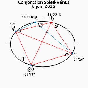 Au moment de l’écriture de cette page, la conjonction Soleil-Vénus est déjà en orbe de l’avant. L’influence se poursuivra au-delà du signe des Gémeaux vers celui du Cancer et peu ou prou perdurera jusqu’au 10 juillet : l’effet peut ainsi se faire sentir bien après la date exacte de la conjonction, si la situation réclamait un délai. Toutefois, il est courant, et même souhaitable, qu’une tendance se dessine, ou s’affirme, le jour de la phase exacte [le 6], plus souvent un peu après, et plus rarement avant. Et ceci s’explique facilement, du moins pour la nature de cette conjonction.