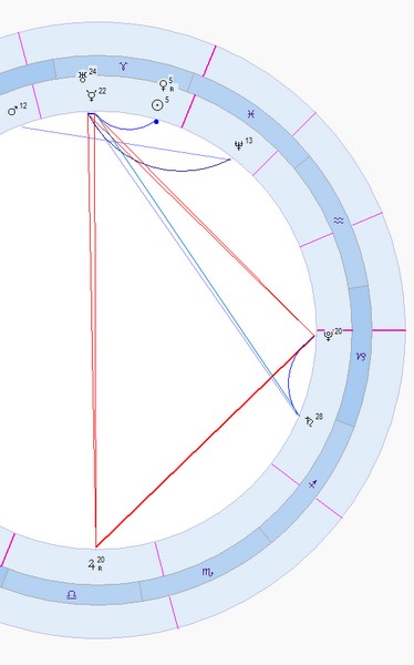 Au global, même si les mouvements de Mercure apparaissent dynamiques et audacieux [Bélier] ils s’insèrent toutefois dans un processus de réparation du fait de l’entourage immédiat du carré Jupiter-Pluton et de l’orbe du triangle dissonant Jupiter-Uranus-Pluton ; tentative louable, certes, puisque la nature a horreur du vide, mais quant à des résultats probants, surtout durables, capable de peser sur le cours des choses, c’est au cas par cas [thème de naissance].
