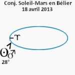 8 avril 2013, par Marc CerbèreLa traversée du signe du Bélier se termine pour la planète rouge [le 20 avril 2013] avec une conjonction Soleil-Mars sur les 28° du signe, le 18 avril. Cette conjonction dégage une force particulière, au-delà du symbolisme courant, parce qu’elle se forme dans le signe dont Mars dispose, le Soleil étant en exaltation = un acte mis en lumière avec promptitude.