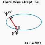 13 mai 2013, par Marc CerbèreUn carré Vénus-Neptune se forme dans la soirée du 13 mai, des Gémeaux aux Poissons, sur les 5°12’. L’orbe de l’influence va peu ou prou jusqu’au 17 mai 2013, Mercure prenant alors le relais pour appliquer au carré à Neptune [le 18].