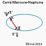 17 mai 2013, par Marc CerbèreA la suite du carré Vénus-Neptune du 13 mai, voici que ce forme dans l’ordre des relais des « rapides » un carré de Mercure par les Gémeaux à la lente Neptune dans le signe des Poissons, le 18 mai 2013 sur les 5°, répartis [carré Mercure-Neptune].