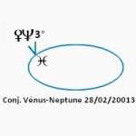 27 février 2013, par Marc CerbèreAlors que la conjonction Mercure-Mars [le 26] se sépare du fait de la rétrogradation de Mercure, les éléments du signe des Poissons retrouvent calme et sérénité avec la formation d’une conjonction Vénus-Neptune [le 28 - 3°], loin donc de la nervosité et, disons-le, de l’accablement d’un certain nombre dans un climat de crise sociale, morale et économique, qui casse les forces vives. Peu de gens sont heureux, sereins, et ça se voit, ça se sent.