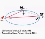 7 août 2011, par Marc CerbèreAlors que l’orbe de l’avant du carré Uranus-Pluton (2012-2015) est à 1° de la première phase exacte (24 juin 2012), le séjour de Mars en Cancer (3 août au 19 septembre 2011) se heurte à une première tension avec Uranus (le 9) et Pluton (le 11).