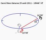 24 août 2011, par Marc CerbèreUn carré Mars-Saturne se forme entre le signe du Cancer et la Balance le 25 août 2011 sur les 14°30’, 10h46’ UT, suivi d’un relais de conjonction de la Lune à Mars à 13h04’ UT.